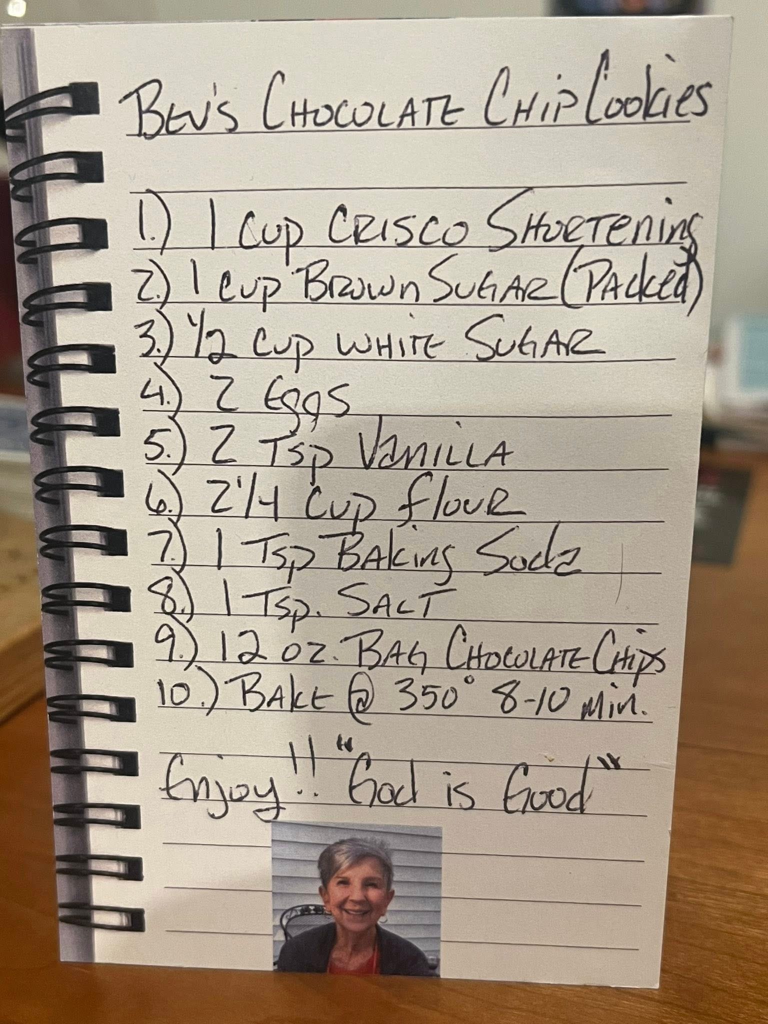 That night, we baked cookies together. Not just any, but my dear mother-in-law’s special recipe. Snickers the dog helped out too. This will be our second Christmas without Bev, who left us a year ago, on Dec. 7, to be with God.