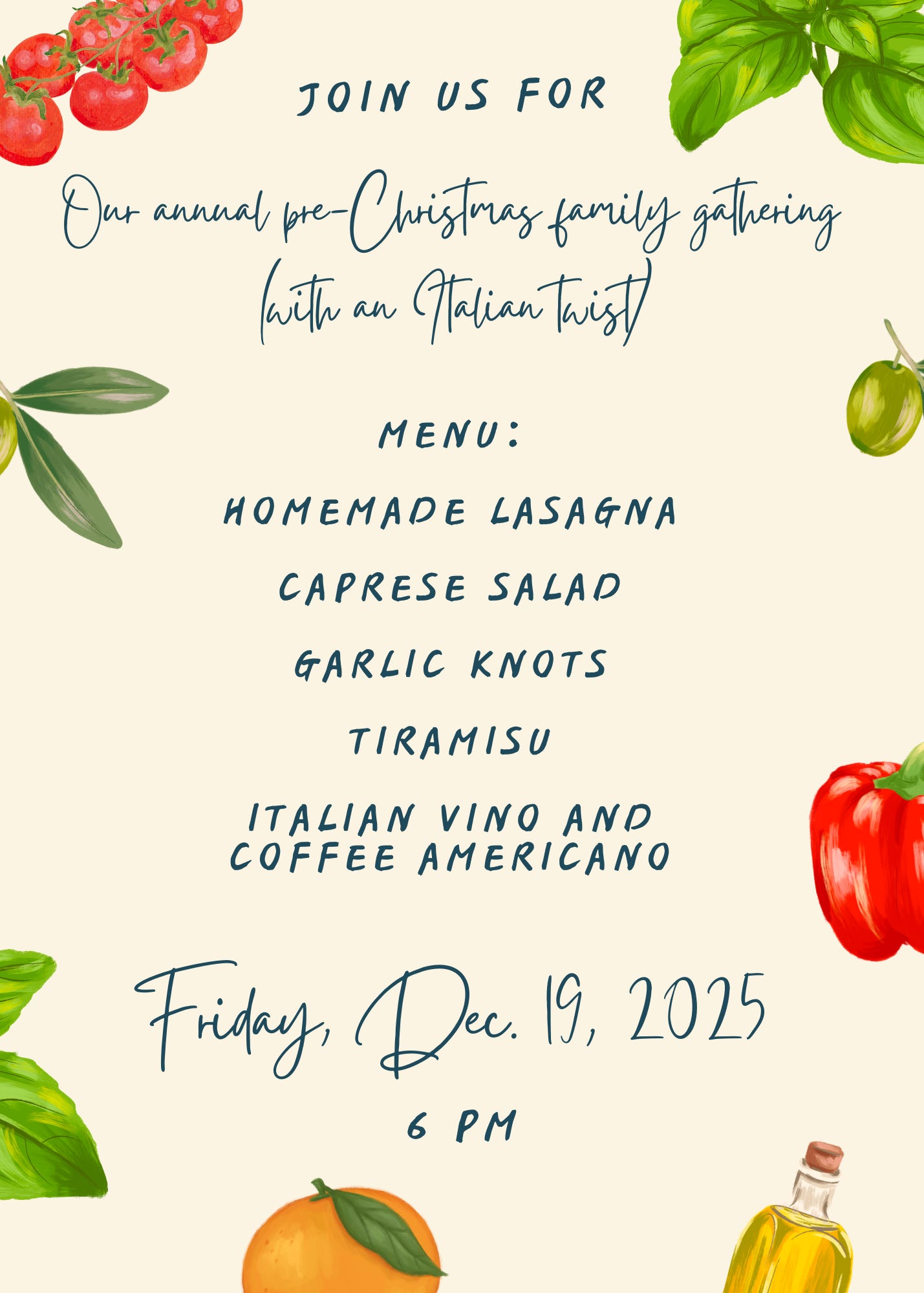 This year, I decided to make it an Italian themed party since we have the goods and gifts to make such a thing happen. We just returned from Italy last month after all! I figured this could be a way for my husband and I to really share this adventure with our family. I even came up with an official invite/menu: